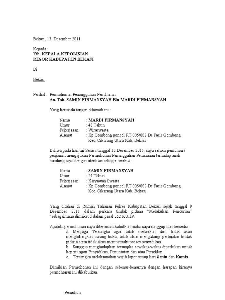 Permohonan penangguhan penahanan surabaya sehubungan proses penahanan atas suami saya tersebut diatas, maka dengan ini saya mohon kepada kepala kejaksaan negeri surabaya c/q kasie.